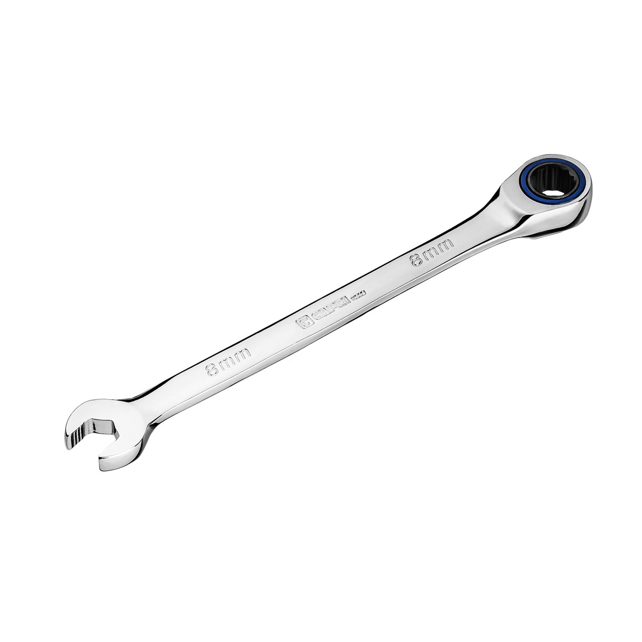 - Experience our true 100-tooth ratcheting combination wrenches in the tightest of spaces. With just 3.6 degrees of swing arc, they will make your job a whole lot easier. Our true single-pawl 100-tooth ratchet gear is achievable only through expert engineering and precise craftsmanship. Its unparalleled smooth ratcheting mechanism makes it a joy to use. All of these components are engineered to fit in a slim profile to make these the go-to wrench for pros. 12-point WaveDrive box end transfer torque uniformly and prevents damaging and rounding of the bolt. 0 degree offset on the box end gives you maximum clearance. Integrated steel color ring makes it easy to identify between SAE (red) and metric (blue) sizes. Open end features 6-point anti-slip groove that grips on the fastener and prevents slippage while you work. The open end is tipped at a 15-degree angle; it is useful especially in tight spots: after each 15-degree turn, flip the wrench over to quickly engage the fastener again. Flawless chrome plating, achieved by thorough polishing and careful application of chrome protective plating, ensures durability and corrosion resistance. Size: 8 mm.